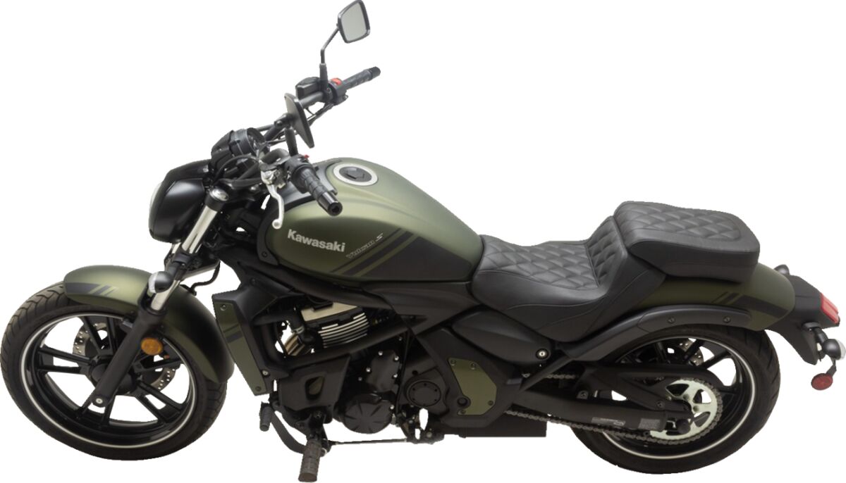 The Kawasaki Vulcan S gives you plenty of options to customize the fit and make it your own; now take comfort to the next level with the Squareback/Fastback by MustangThe solo seat has an aggressive look and generous rise and a comfortable 12” wide seating area For even more driver comfort, pair it with a passenger seat that overlaps the top of the solo for even more driver back supportWide bucketed rider area provides excellent support with an aggressive lookPlaces the rider at a similar reach compared to stockHand sewn cover with classic single diamond stitching made from marine-grade expanded vinylMustang’s proprietary controlled-density foam formula requires no break-in and retains shape and support after years of useMarine-grade fiberglass baseplate for long-lasting support and durability, with polyurethane bumpers to absorb vibrationMade in the U.S.A.